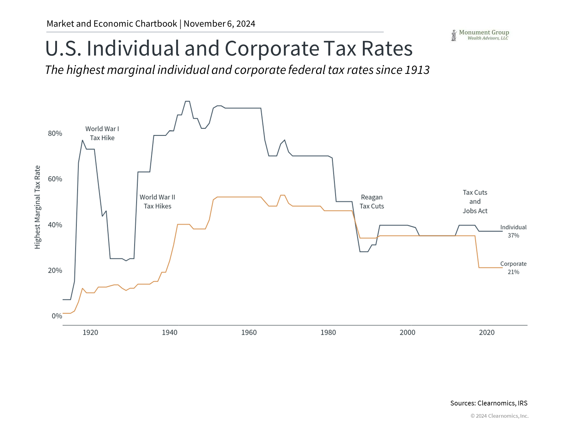 The market has performed well across many tax regimes across history, including periods when the highest marginal rates were between 70% and 94% after World War II. Taxes today are low by historical standards. As the national debt grows, it’s prudent for investors to expect tax rates to eventually rise. Planning for this possibility is only growing in importance.