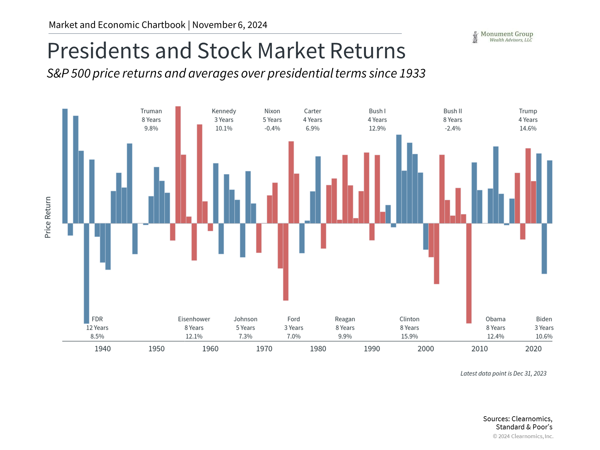 This is not to say that good policies don’t matter, but instead that business cycles are driven by factors beyond politics. What’s more, policy changes tend to be incremental, even when a President’s party controls Congress. History also shows that it is very difficult to predict how any particular policy might affect the economy and markets since stock prices adjust to new policies and companies adapt quickly as well.