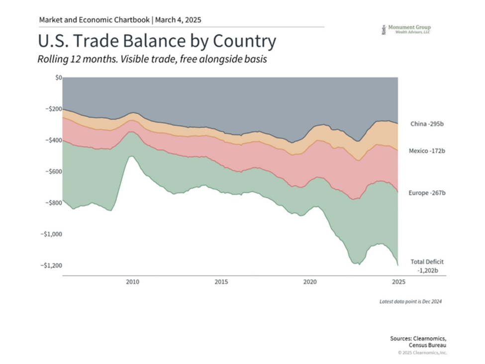 Tariffs can be concerning because they represent taxes on imported goods that can then be passed on to buyers. With inflation rates still hotter than many would like, tariffs could add further pressure to the prices of everyday necessities. This is made worse if other countries retaliate with their own tariffs, sparking an escalating trade war. As the accompanying chart shows, the U.S. runs a significant trade deficit with many major trading partners.